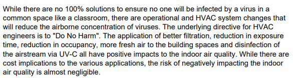 "...while the current focus may be on SARS-CoV-2/COVID-19, improving IAQ in education facilities will have similar benefits for other airborne pathogens and studies have shown reduced absenteeism and better performance from students."