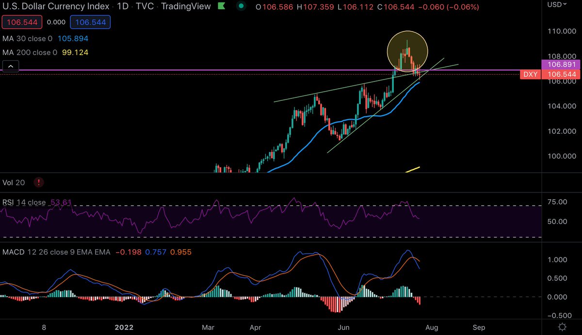 (3/X) At the same time, the chart on the weekly and on the daily shows a significant false breakout out of a bearish rising wedge. On the weekly we also see a bearish divergence. On the daily, a bearish MACD crossing.