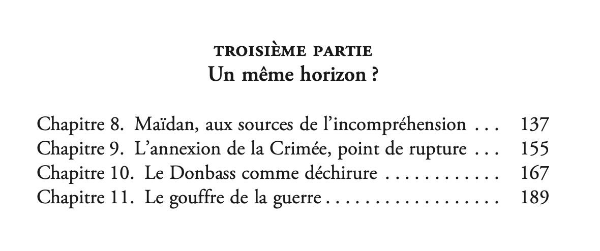 Le livre pose trois questions: Russie et Ukraine partagent-elles la même histoire ? Les deux sociétés sont-elles semblables aujourd’hui? L’avenir peut-il s’écrire en commun pour elles? Ces questions forment les trois parties du livre. 7/17
