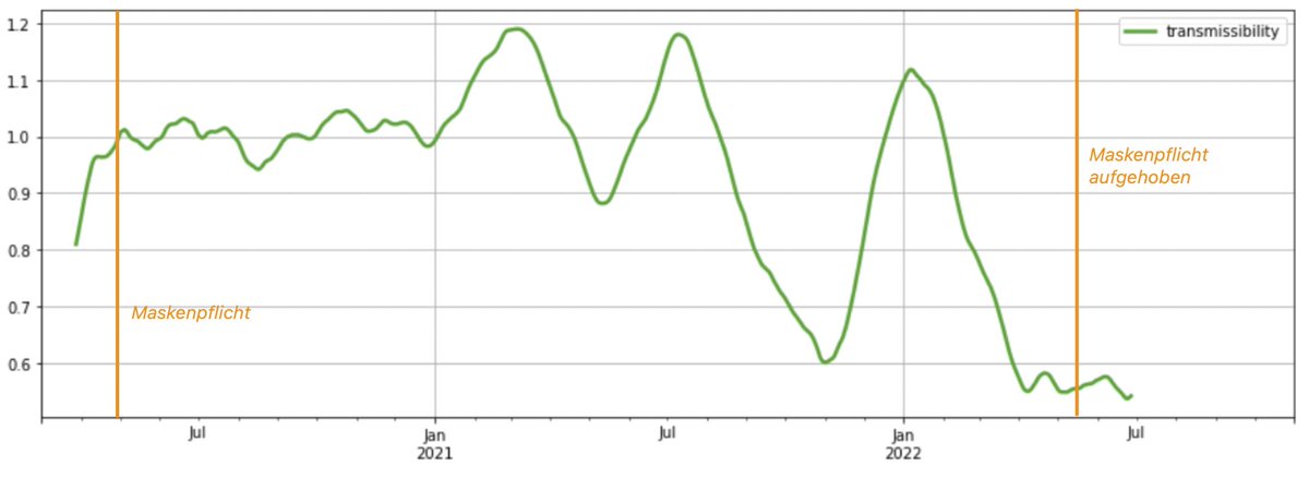 Hat der Einsatz von Masken zur signifikanten Reduktion der #SARSCoV2 Fallzahlen in Deutschland geführt? Die Berechnung der Transmissibilität T, die ja von Masken reduziert werden sollte, aus den Reproduktionszahlen der letzten drei Jahre gibt dazu eine eindeutige Antwort. 1/