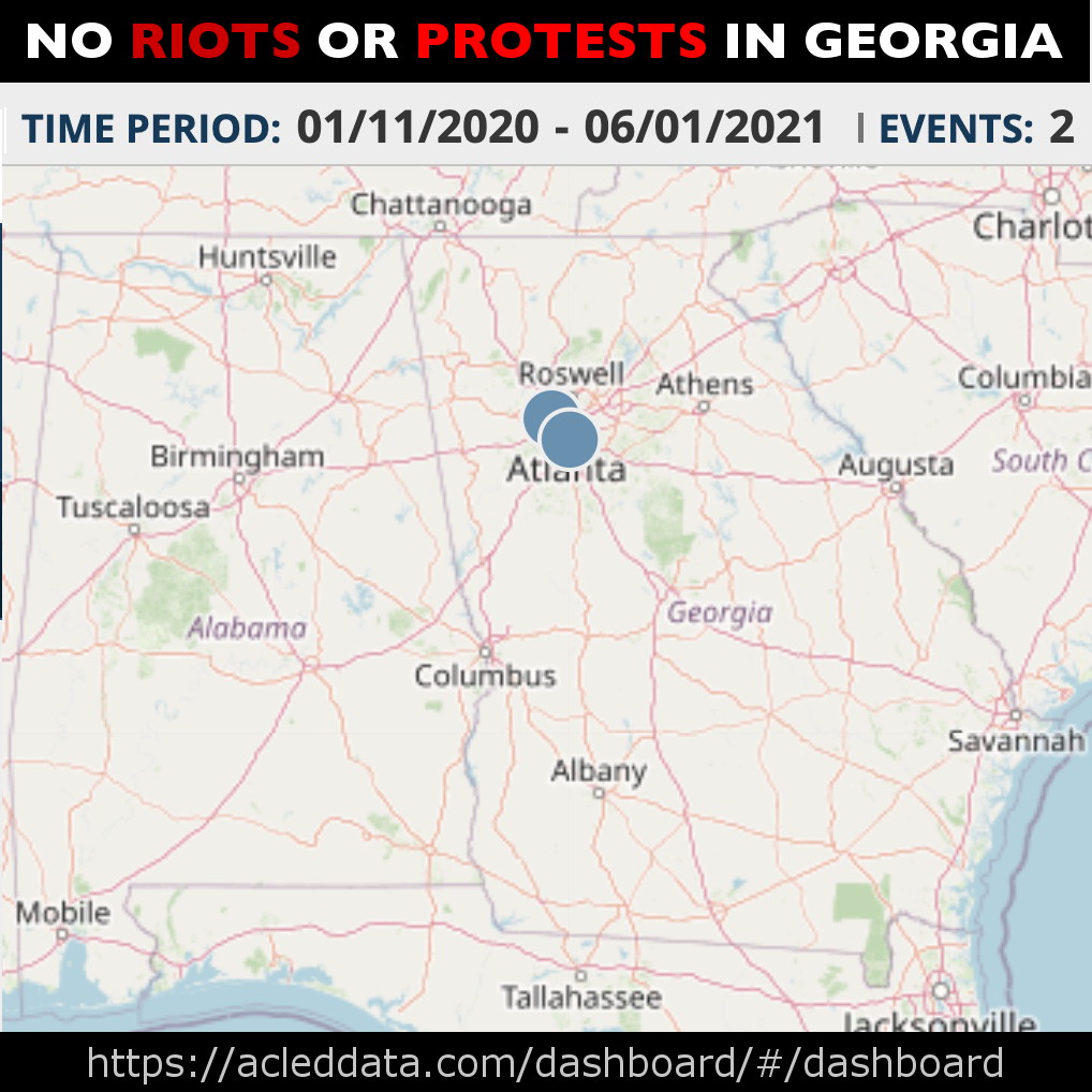 .@DineshDSouza In 2000 Mules, why did Gregg Phillips claim that TTV had tracked 'three dozen of our mules' to BLM/Antifa riots in Atlanta, when 1) ACLED & TTV don't have device ids, and 2) there were NO riots in Georgia for TTV's time period?