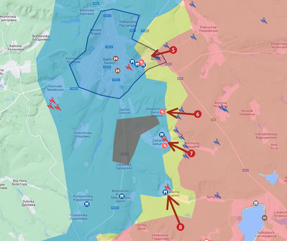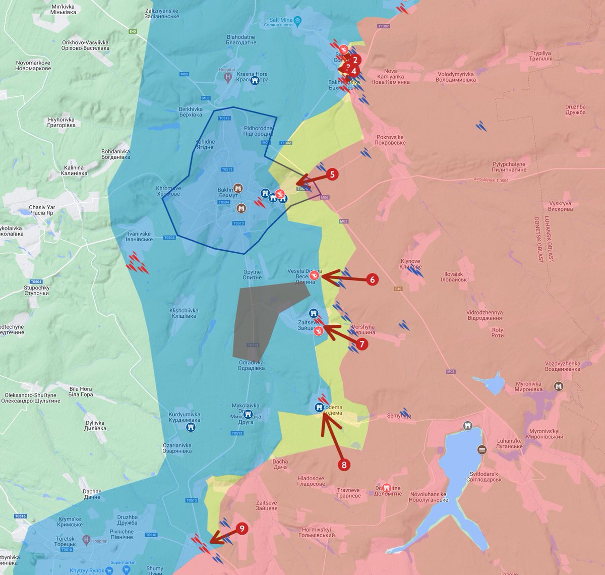 There is ongoing fighting around Bakhmut (5), Vesela Dolyna (6), and Zaitseve (7) without notable changes. There is heavy fighting south of Kodema (8), and I believe Ukraine only controls the northern side of the town. The southern part is contested.