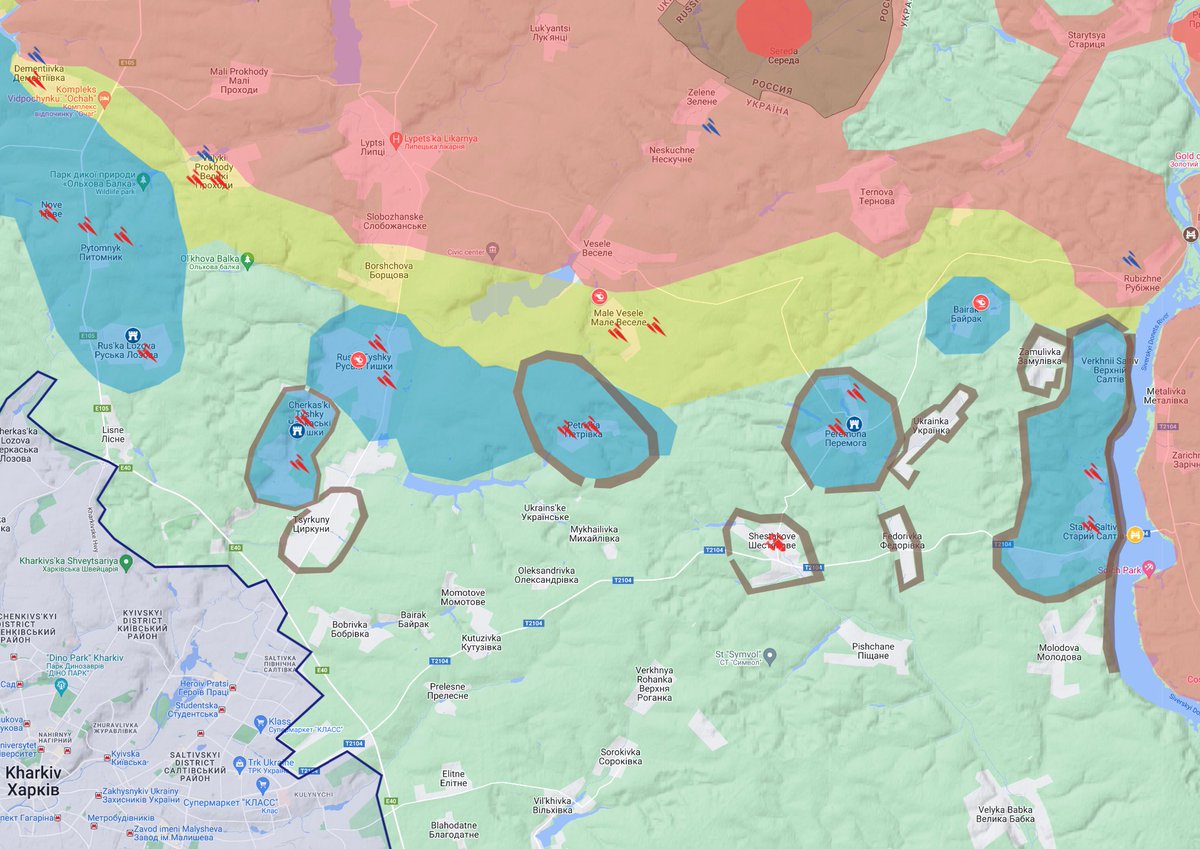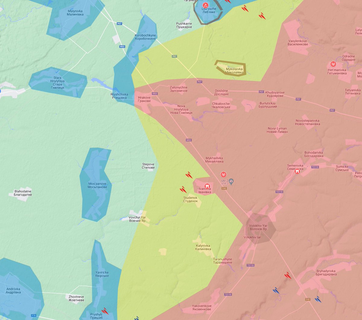 The area around Hrakova, Ivanivka, Mykhailivka (another one!), Volokhiv Yar, and Semenivka is a bit of a question mark. Ukraine attacked these towns numerous times in the past, and they could control one or all of them. I choose to draw the map conservatively.