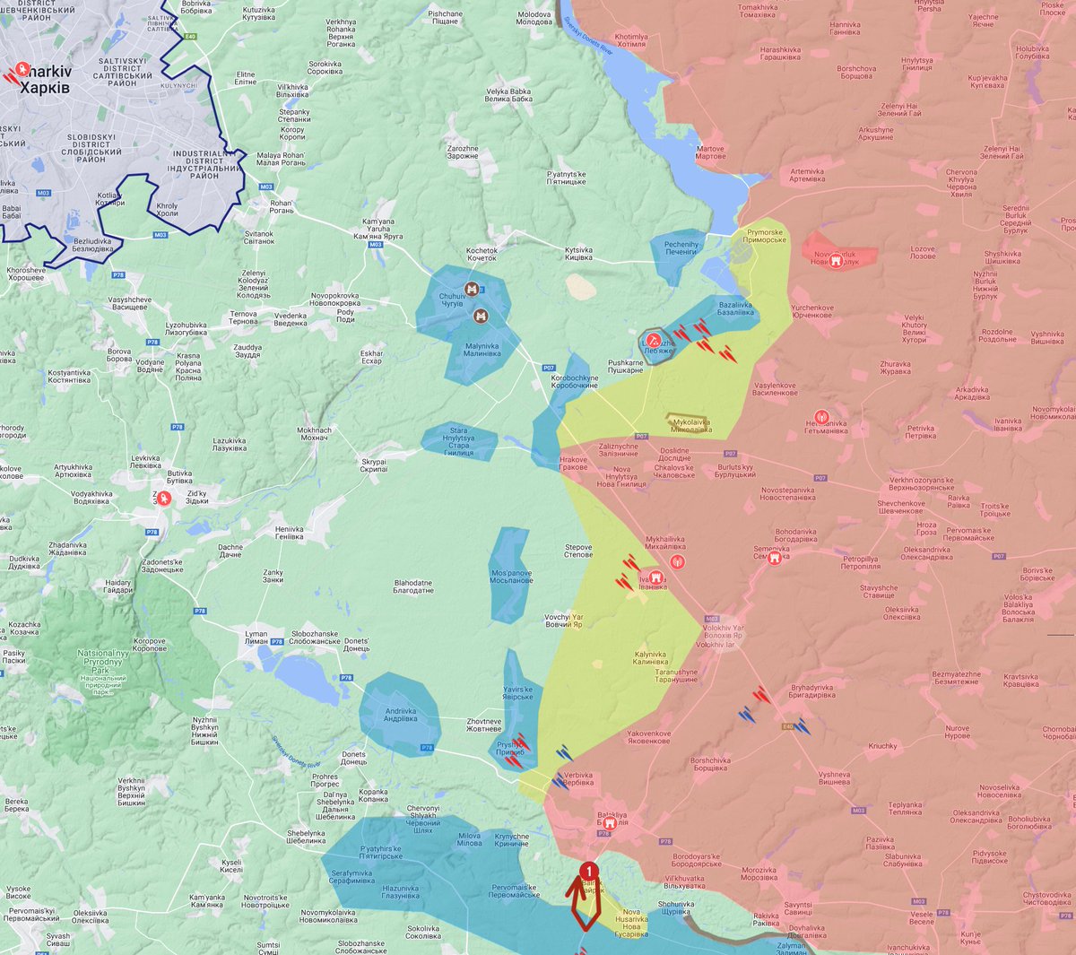 South of Balakliya, Russia attacked Husarivka today (1). Ukrainian defenders repelled the attack. I believe Bairak and Nova Husarivka are both contested, meaning Russia passes through these areas to attack Husarivka.