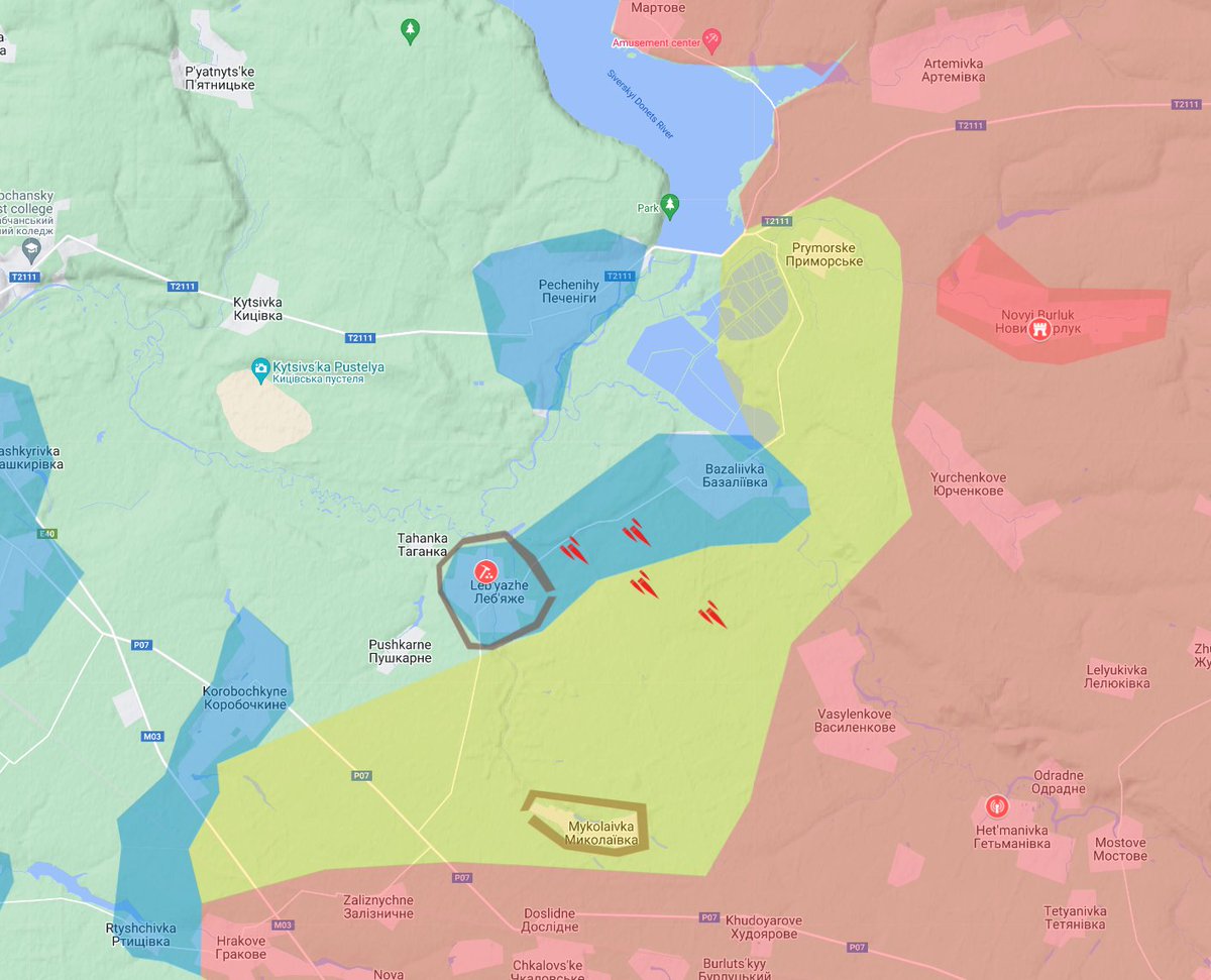 I know Russians attacked west from Yurchenkove and Vasylenkove, and I know Ukrainians have been operating around the Pechenihy dam, so I have marked all the areas east of Pechenihy and Bazaliivka and south of Lebyazhe as contested. Today Russians remotely mined Lebyazhe with MLRS