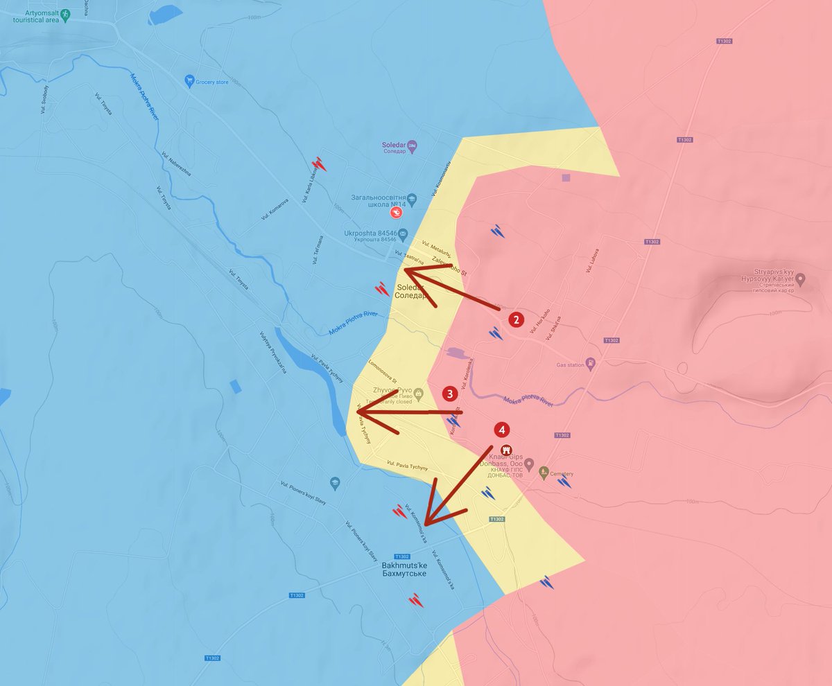 From what I understand, the fighting in Soledar has moved closer to the Knauf Gips plant, which Ukraine is heavily shelling. Russian forces primarily attack south (4) and west (3) from the plant. Which is another way of saying Russia is attacking Bakhmutske.