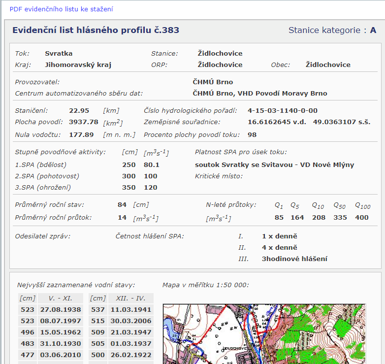 Po rozkliknutí konkrétní stanice je v okně nahoře ještě zajímavý odkaz Evidenční list hlásného profilu. V tom mj. najdete historické maximální stavy pro daný profil.