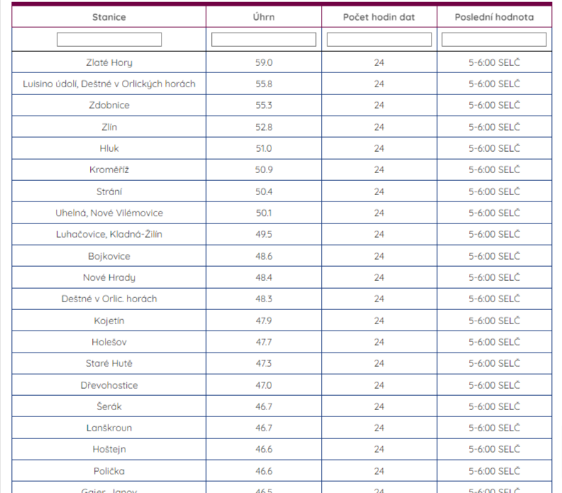 Aplikace sestává z mapové a tabelární části a umožňuje sledovat srážky v různých intervalech a v tabulce vyhledávat a filtrovat. Oficiálním zdrojem, avšak dostupným jen pro tzv. profesionální stanice, kterých není tolik je na stránkách ČHMÚ například .envidata.cz/rain chmi.cz/aktualni-situa…