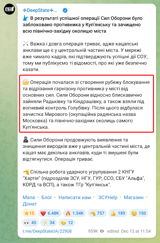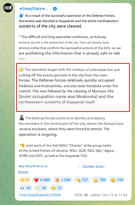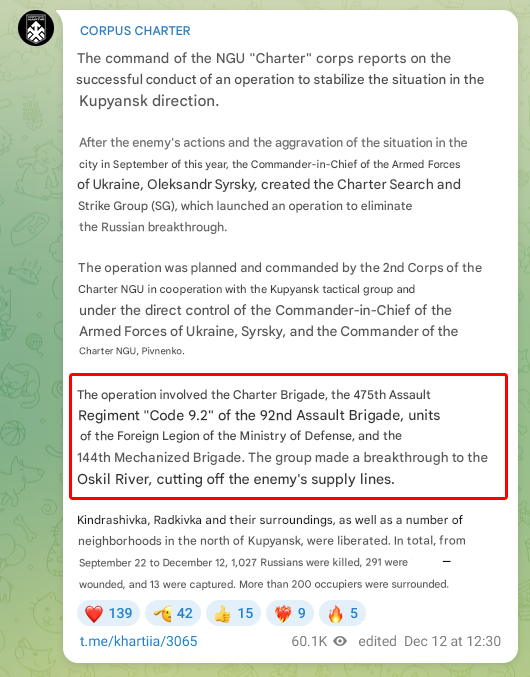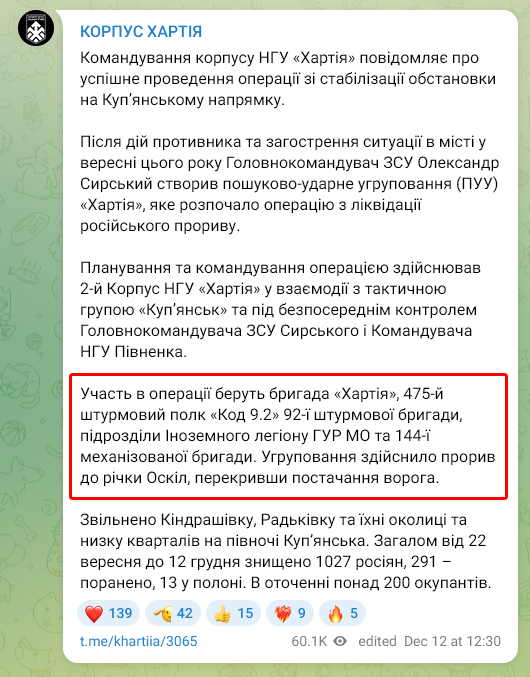"Освобождены Кондрашовка, Радьковка, их окрестности и ряд кварталов на севере Купянска. Всего с 22 сентября по 12 декабря уничтожено 1027 россиян, 291 ранено, 13 в плену. В окружении более 200 окупантов"