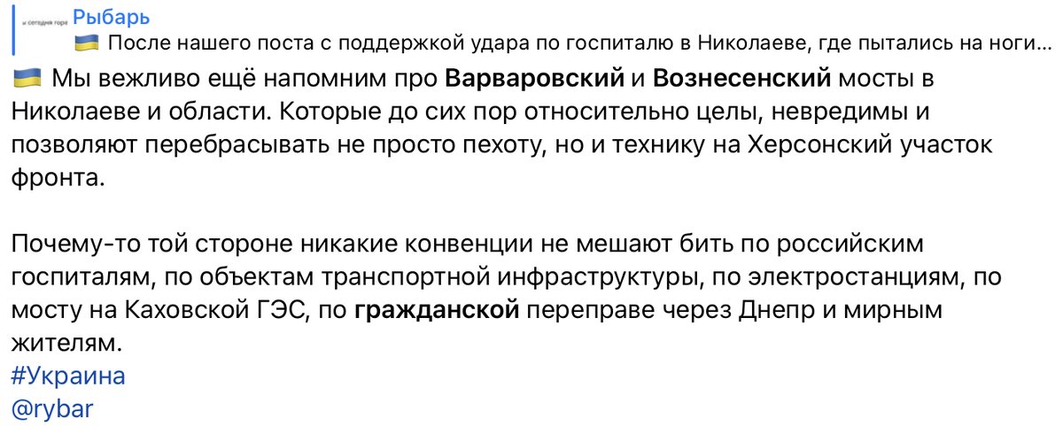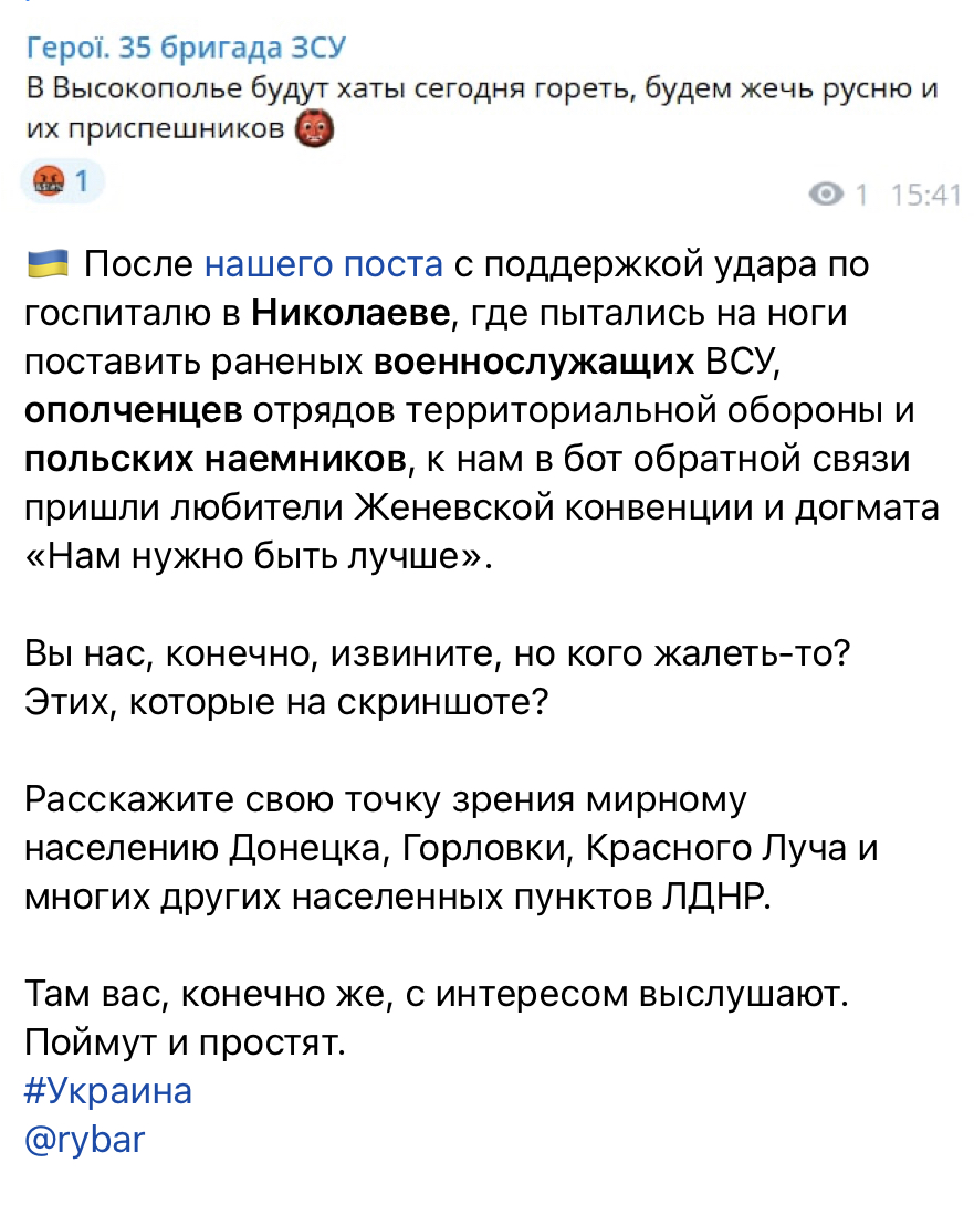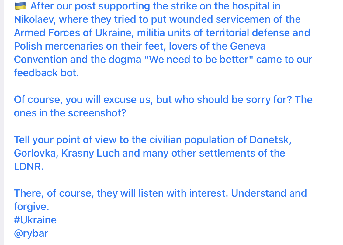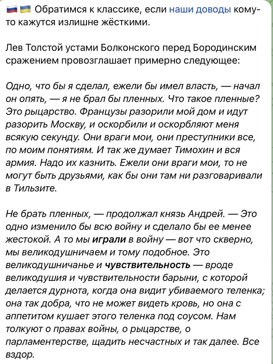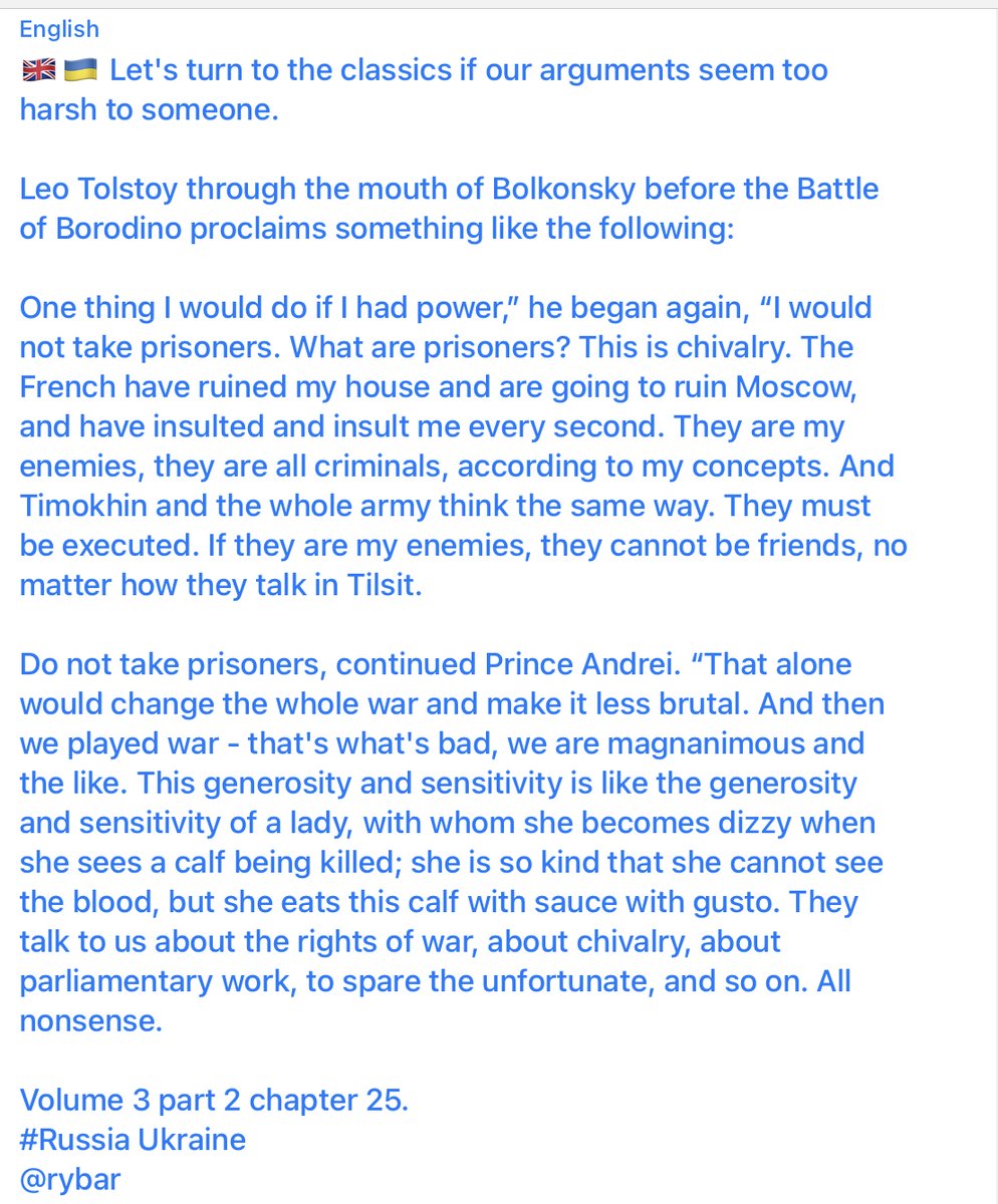 So I’m just getting around to reading this now, but Rybar went on a day long hissy fit because his own pro-russian readers said that what russia did was a warcrime? So his response was to basically say “we’re russian, warcrimes is what we do, haven’t you read tolstoy?“ clown show