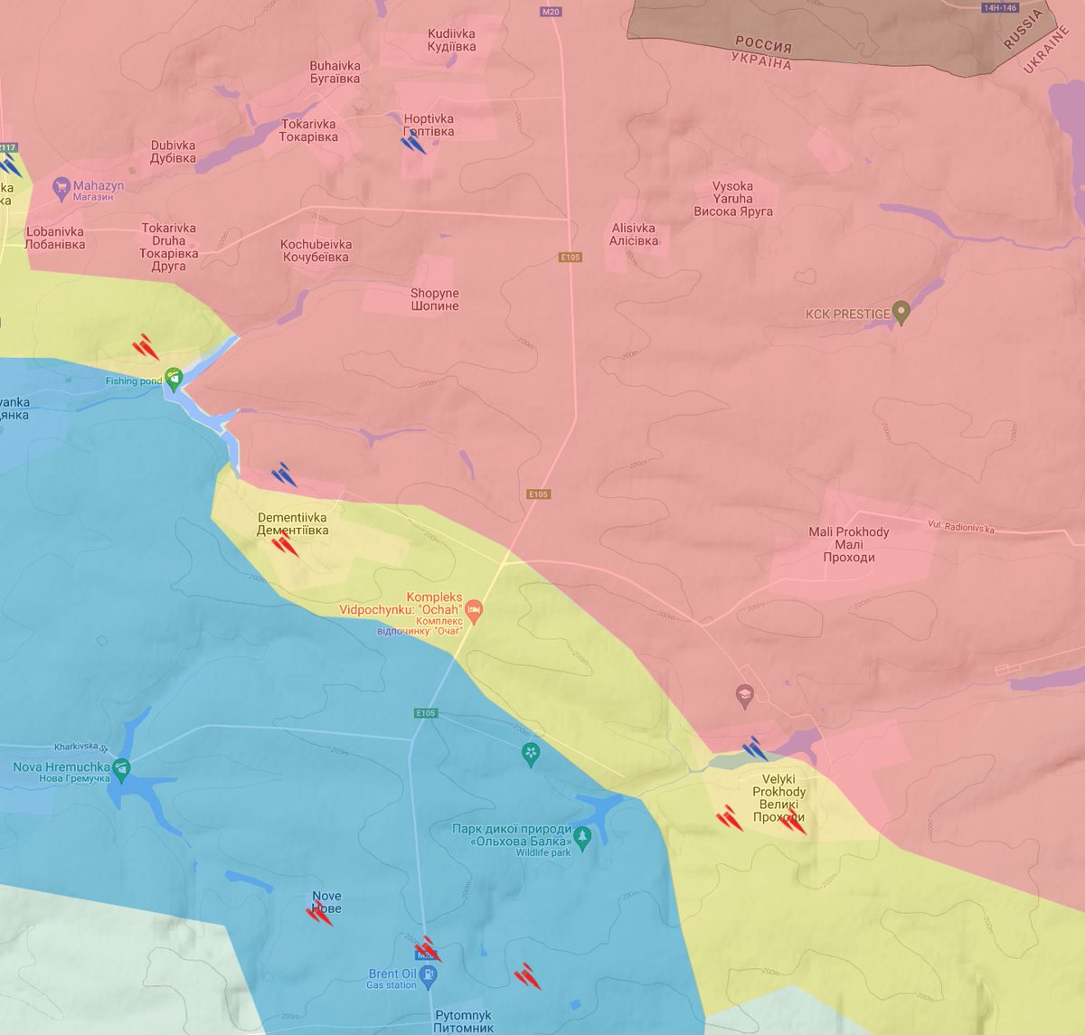 I heard, without details, that Ukraine changed its deployment in the Kharkiv area. Russian sources claim Ukraine plans to attack north up the E105 toward Velyki Prokhody, Mali Prokhody, Dementiivka. I have no reason to believe this is accurate, but I figured I would mention them.