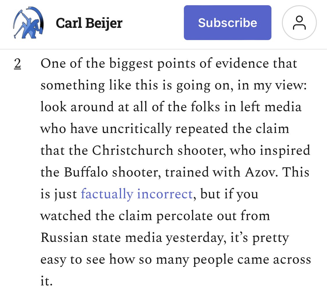 To prove the narrative that "Ukraine" was behind Buffalo massacre is being "dutifully promoted by Russian state-sponsored media," Beijer links to one of my tweets