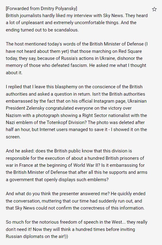 “So much for the famous freedom of speech in the west… Now they will think a hundred times before inviting a Russian diplomat on the air” t.me/dpol_un/269