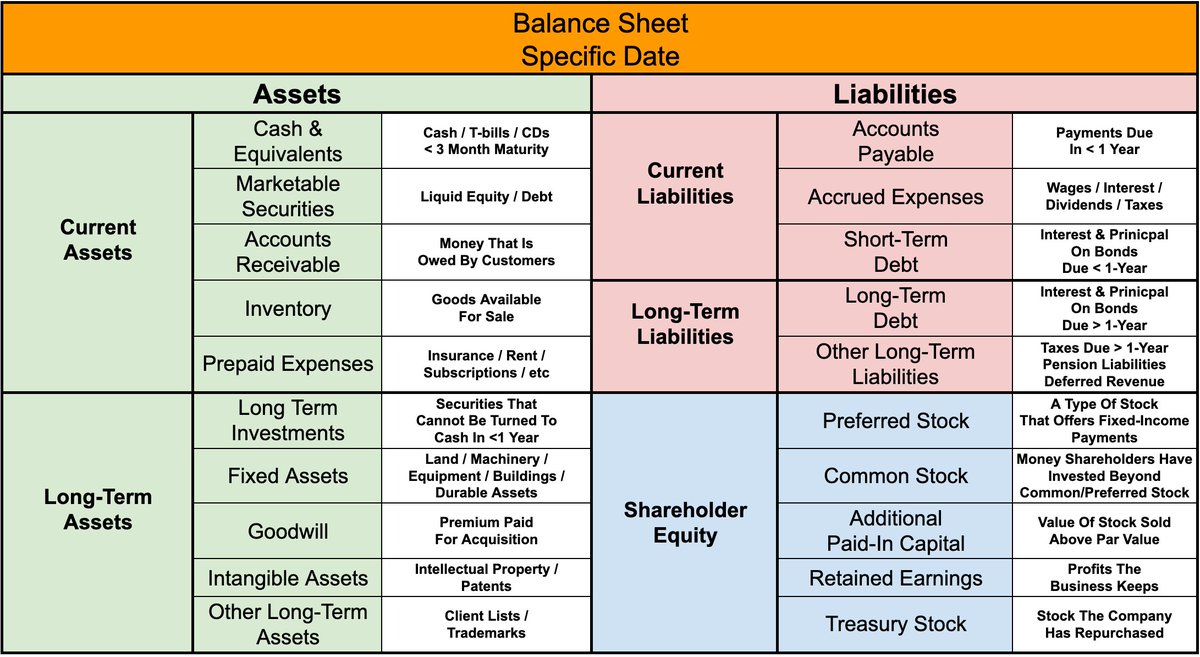 A balance sheet is a SNAPSHOT of a company’s net worth at a POINT in time, usually measured at the end of a quarter/year.