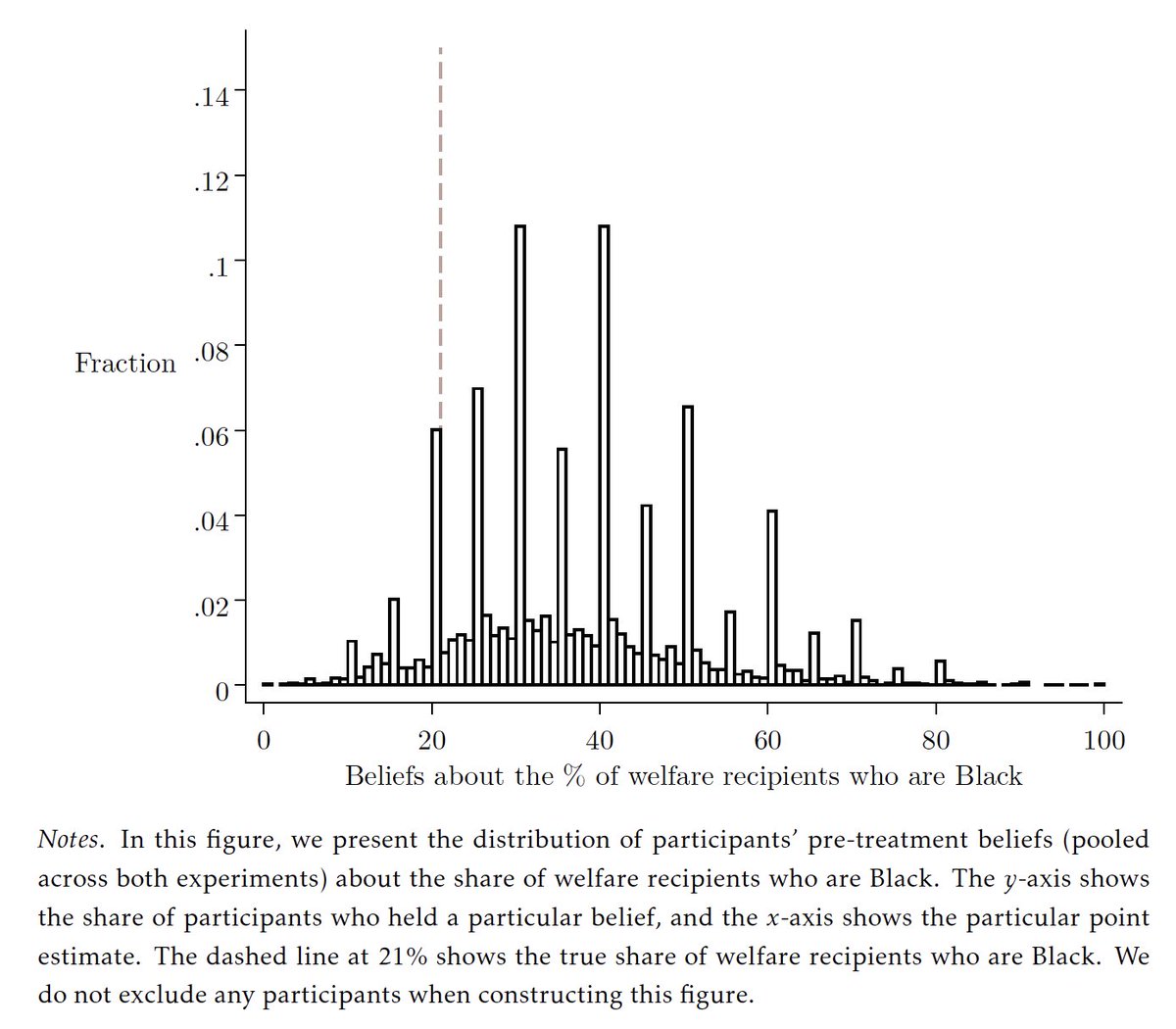 Motivation: Many observational studies suggest that people's (incorrect) beliefs about welfare recipients being disproportionately Black limit their support for related spending.