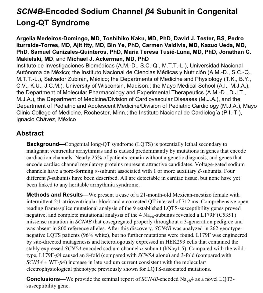 En el 2006 junto con la Dra Medeiros y todo su equipo hicieron la descripción de una nueva mutación génetica en el SCN4B dando lugar a un nuevo tipo de QT largo…les dejo el link del artículo original…cont