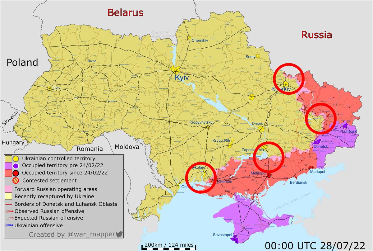 Russland hat seit Anfang Mail in 80 Tagen unter extrem hohen Verlusten etwa 50 km Territorium erobert. Sah es noch vor Wochen so aus, als würde Russland getrieben von massiver Artillerie und Raketenartillerie, langsam aber sicher vorankommen, steckt der Angriff jetzt fest. 2/