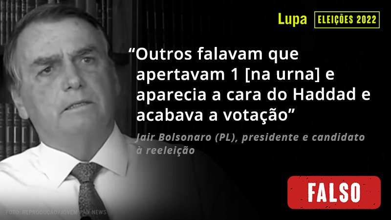 Há um corte de edição no final do registro. Em nota, o @TREMinas confirmou que o vídeo é falso. “Não existe a possibilidade de a urna autocompletar o voto do eleitor, e isso pode ser comprovado pela auditoria de votação paralela”, afirmou o tribunal. #BolsonaroNaJovemPan