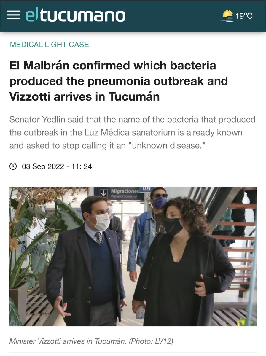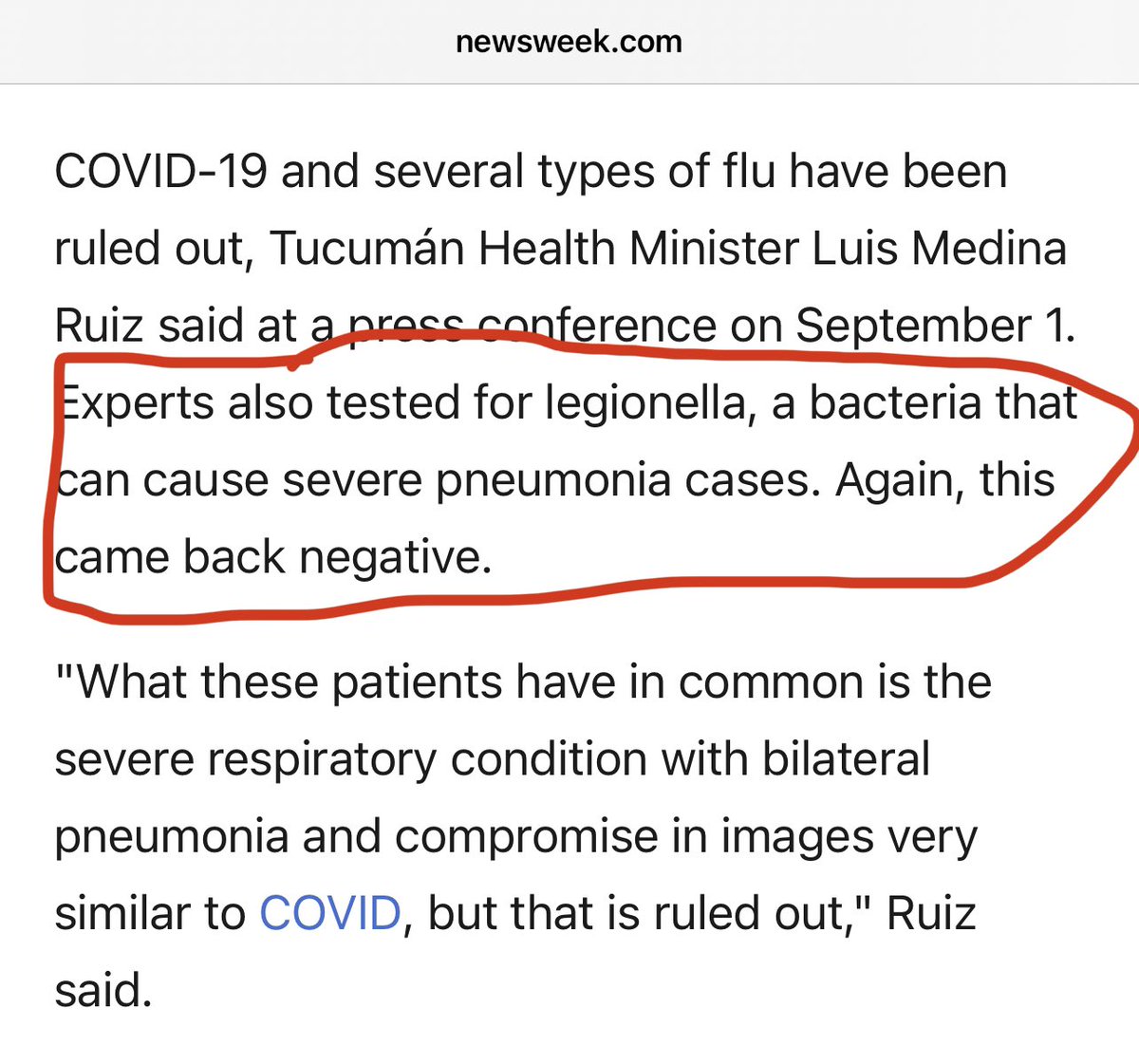 CAUSE FOUND? The “unknown pneumonia” in Argentina is reportedly legionella bacteria, according to statements by a senator, but not officially confirmed yet. However, earlier tests negative for Legionella. It has now claimed 3 lives, including 2 HCWs. eltucumano.com/noticia/actual…