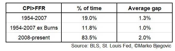 Excluding Arthur Burns' chairmanship, gap between FFR and #CPI was twice as large on average after 2008 compared to the period prior to 2008.