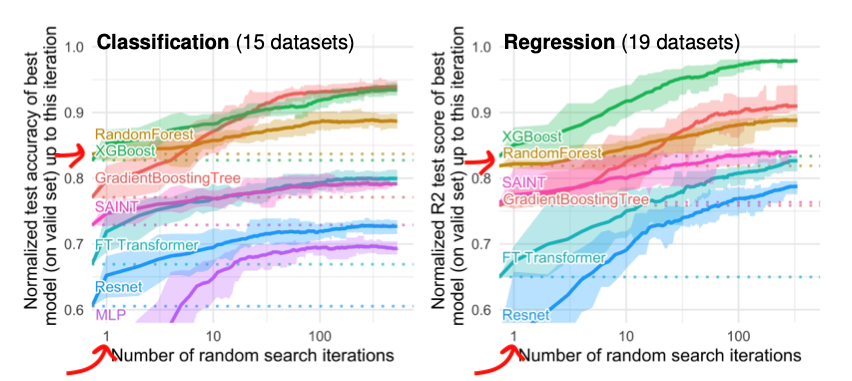 [3/6] The authors also looked at both numerical and mixed numerical & categorical datasets (categorical features were one-hot encoded). The results hold: tree-based methods perform well
