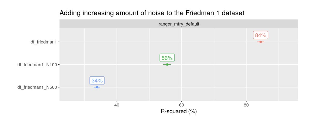 [3/5] According to "Hyperparameters and Tuning Strategies for Random Forest" (Probst, Wright, Boulesteix 2019), the number of trees at each node (here called "mtry") is the most influential hyperparameter for random forests. Increasing it improves perf in the presence of noise: