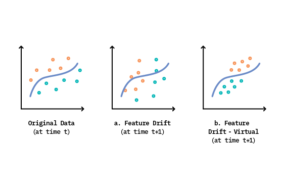 [3/10] In a nutshell, feature drift describes the change in the input feature distribution over time. In rare cases, this is not harmful (subpanel to the right), but in most cases, it will require retraining the model (subpanel in the center)