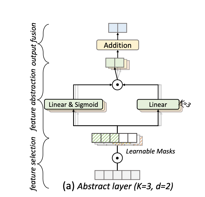 [2/9] The main idea behind DANets is to introduce an Abstract Layer (ABSTLAY) building block; multiple such blocks are then stacked to form a DANet. What does ABSTLAY do? It performs two steps: 1) feature selection and 2) feature abstraction.