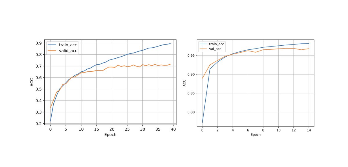 Another classic. We typically don't want the gap between training and validation accuracy to be too large (left: bad, right: better)
