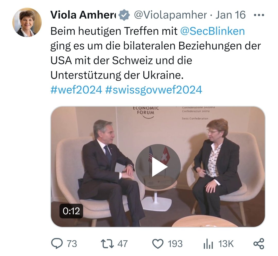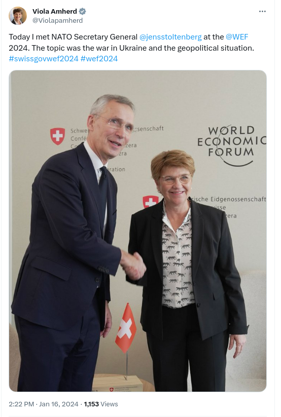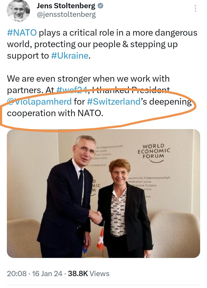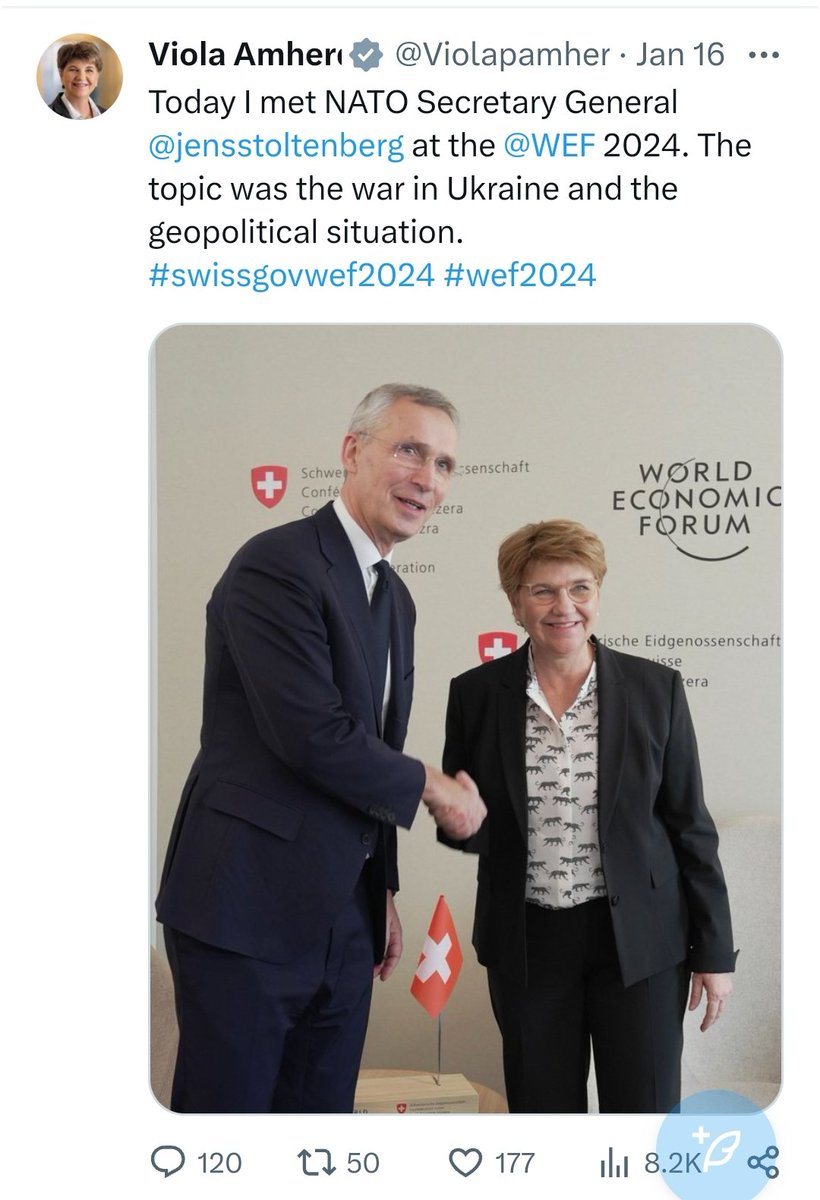 44/ Am #wef24 trifft BR @Violapamherd Leute wie @jensstoltenberg und @SecBlinken, erhält ihre Befehle und kann somit ihre Pläne für eine rasch(er)e Annäherung an die NATO noch beschleunigen.