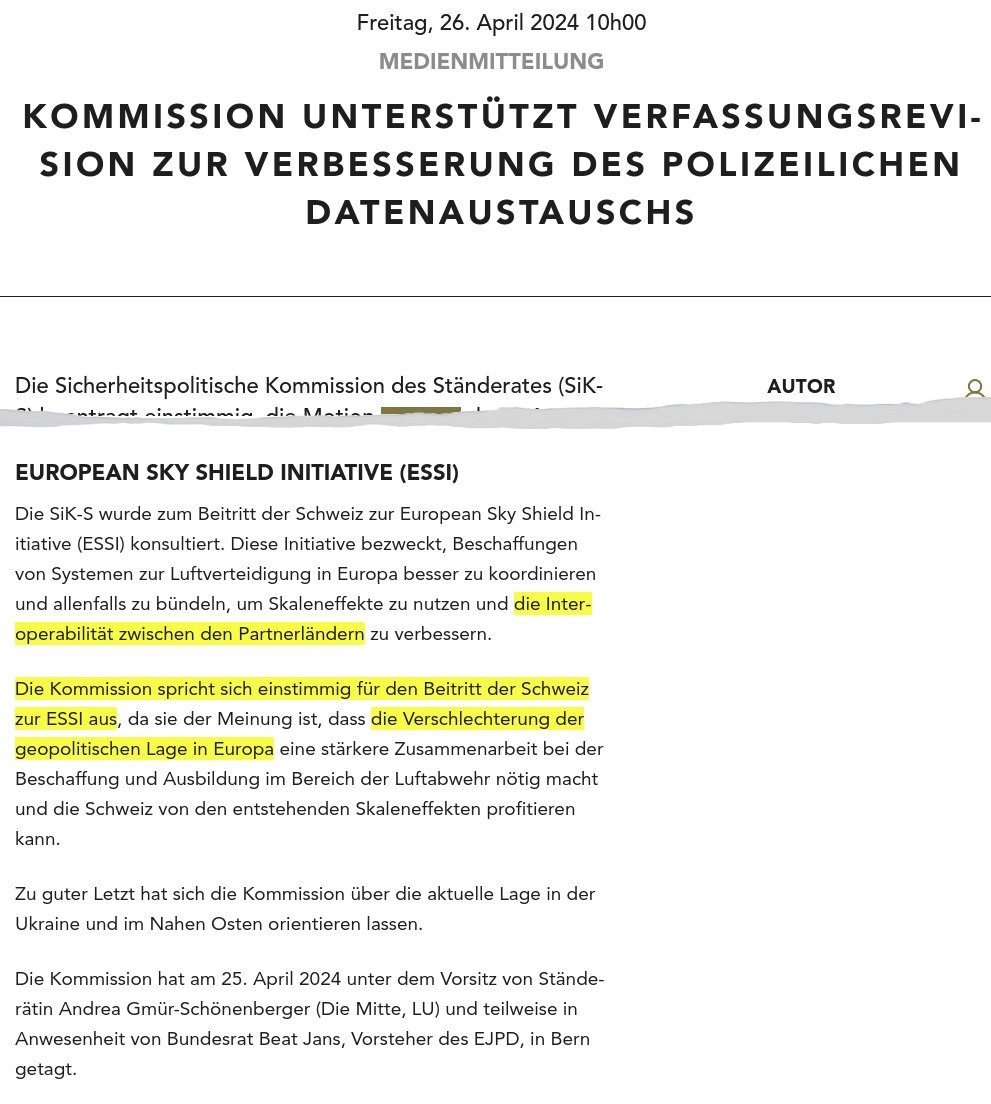 60/ @ParlCH - Die Sicherheitspolitische Kommission des Ständerates (SiK-S) spricht sich einstimmig für den Beitritt der Schweiz zur #ESSI aus.