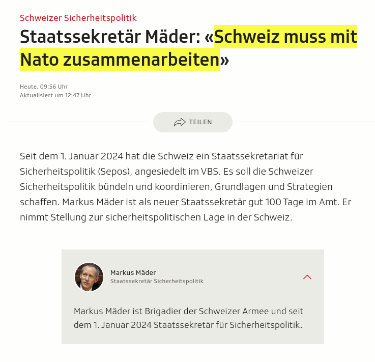 61/ "Staatssekretär Mäder: «Schweiz muss mit Nato zusammenarbeiten»"