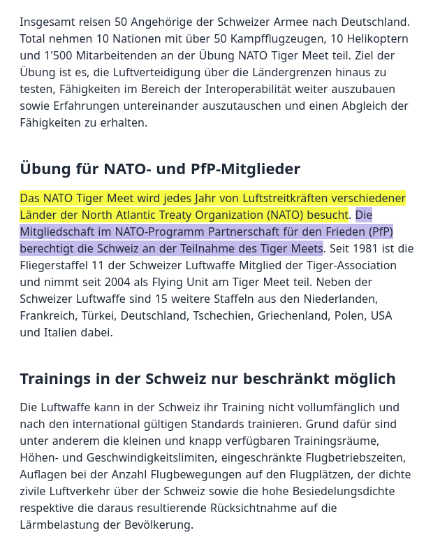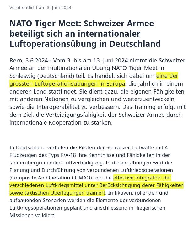 67/ "NATO Tiger Meet: Schweizer Armee beteiligt sich an internationaler Luftoperationsübung in Deutschland"