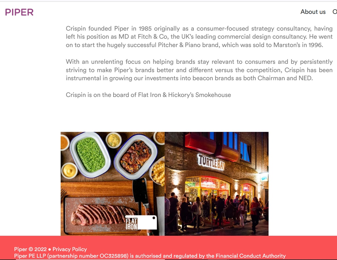 Crispin founded Piper in 1985 ..having left his position as MD at Fitch & Co ... He went on to start the hugely successful Pitcher & Piano brand, which was sold to Marston’s in 1996