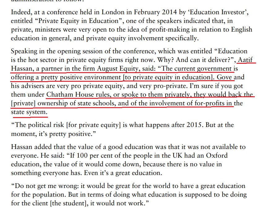 ".. Aatif Hassan, a partner in the firm August Equity, said:“The current government is offering a pretty positive environment [to private equity in education]. Gove and his advisers are very pro private equity, and very pro-private. I’m sure if you got them under Chatham House.."