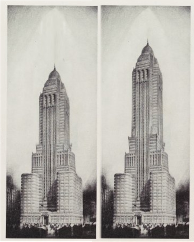 Pero como justo al lado habían comenzado las obras del Chanin Building (iz.), que iba a tener 56 plantas, Reynolds le dijo a Van Alen que de eso nada, que había que subir el rascacielos mucho más.