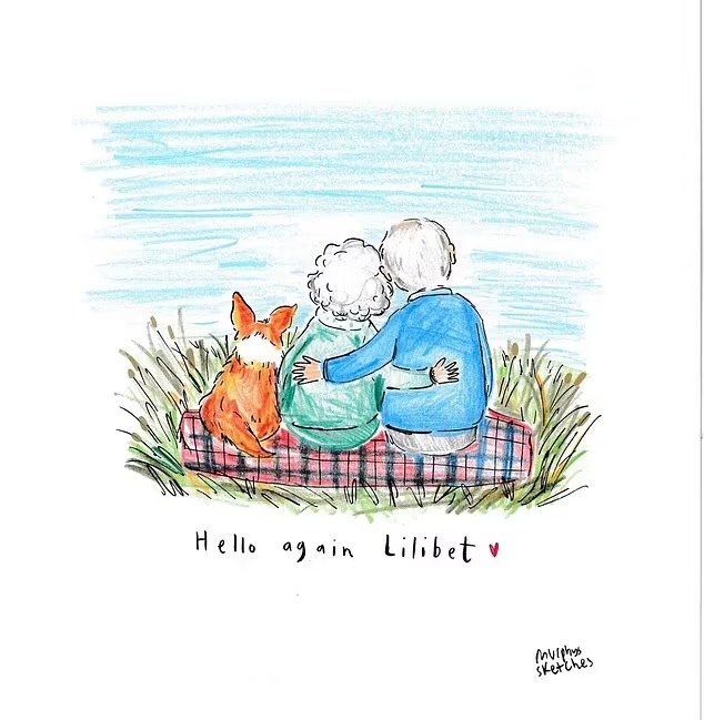 Another widely shared illustration shows the Queen and Prince Philip with their arms around each other looking into the distance sitting on a plaid blanket in the middle of a field - with one of the Queen's corgis snuggling up close