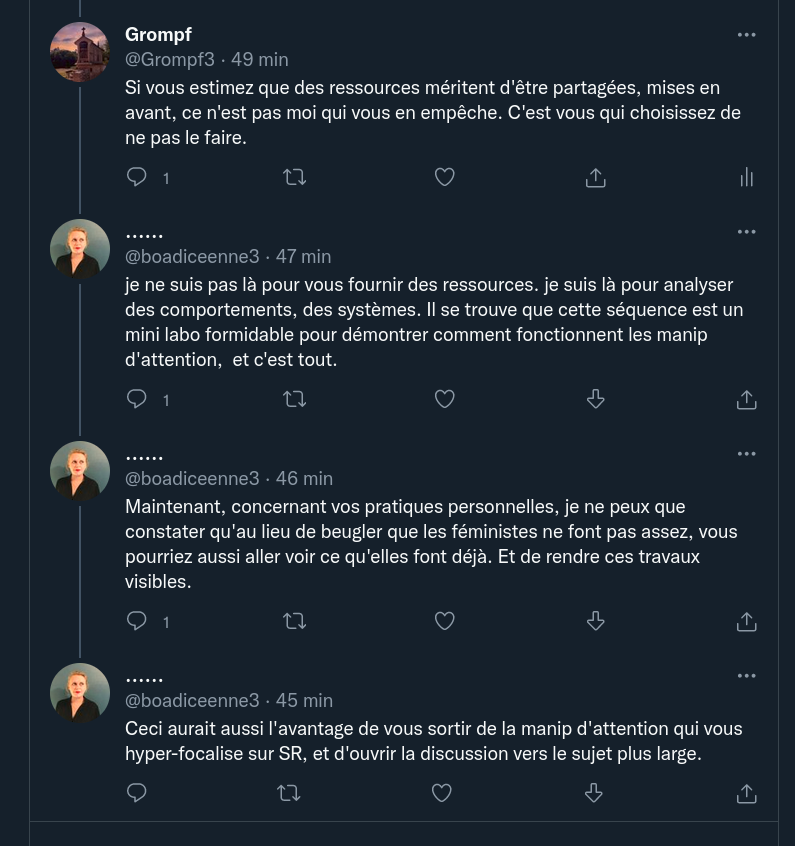 Ce qui est intéressant, c'est que tout en mettant en avant des screens tirés de mon compte et des messages me citant nommément et interprétant mes comportements, @boadiceenne3 et @Marie_Peltier (qui RT joyeusement) m'enjoignaient à ne pas me sentir personnellement visé.