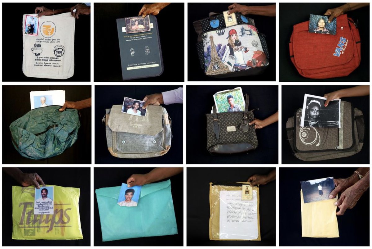 It simply shows the hands of people holding bags with old photos of their one-time owners: their family members who were forcibly disappeared in #SriLanka at the end of the civil war in 2009.