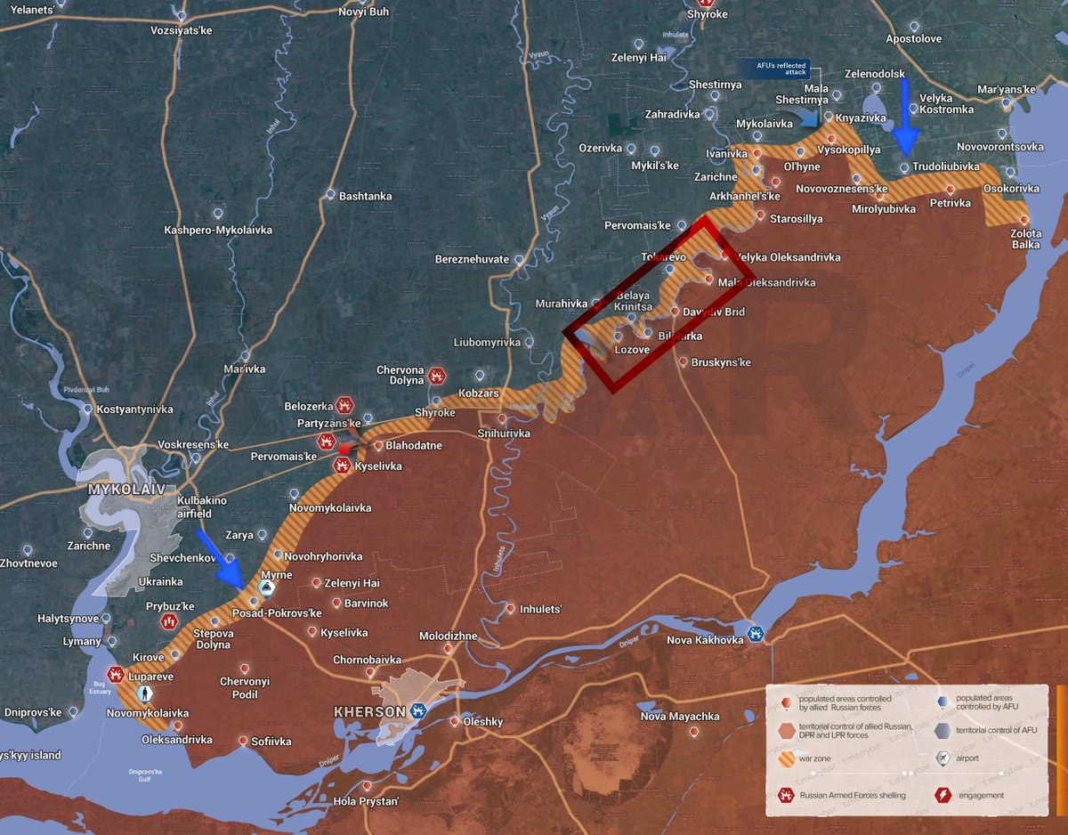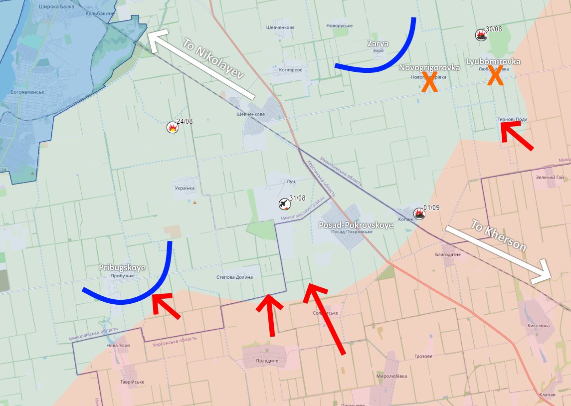 On the Nikolayev-Kherson highway, RU forces have regained most of the ground that was lost during the initial UKR attacks; the villages of Novogrigorovka and Lyubomirovka were fully destroyed along with entrenched UKR units. UKR now on the defensive here