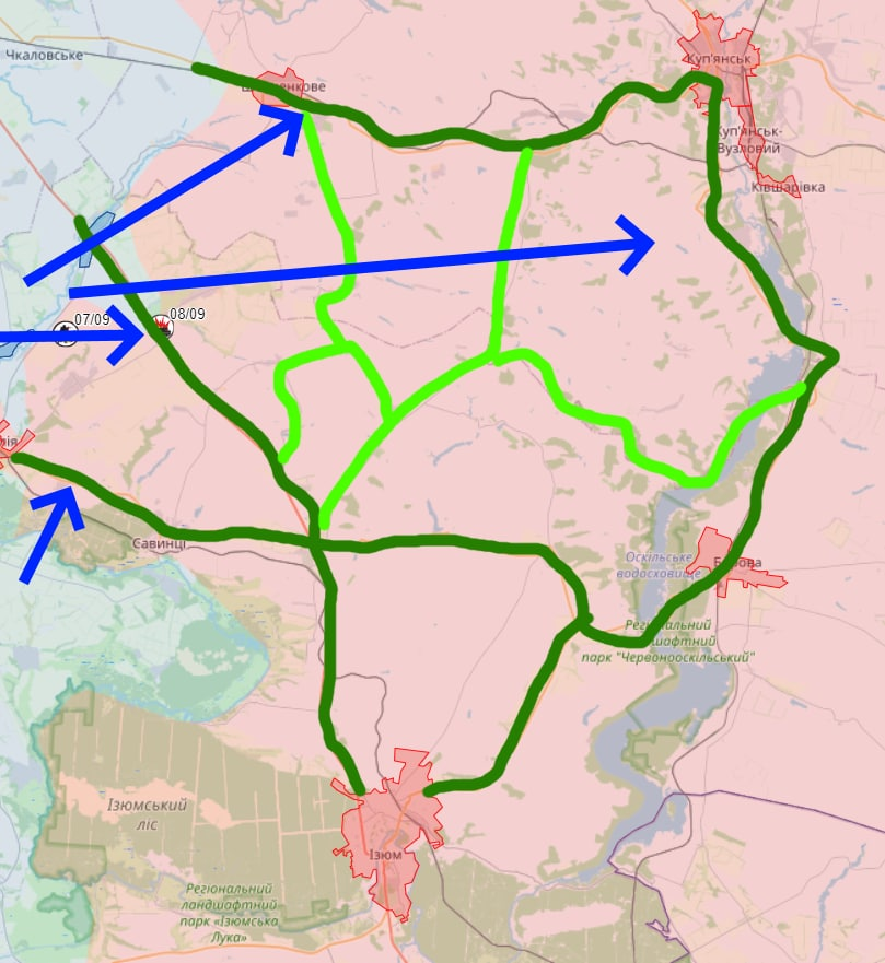 - Losing or capturing settlements is not as important for this battle as for others; the fighting is occurring mostly over roads, highways, logistics, supply routes. The Ukrainians want to cut off/take over these roads marked in green (drew this yesterday so not up to date)
