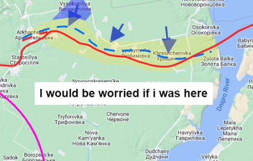 The Ukrainians are beginning to open up a very interesting salient north of Kherson City. If Ukrainian forces can cut off Russian troops east of the T2207, that effectively cuts them off from existing crossings over the Dnipro.