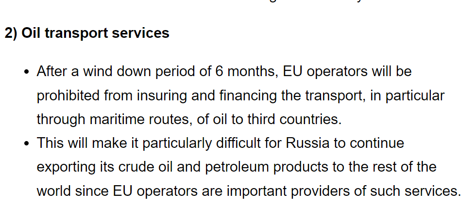 8/ What are the options: Essentially, the oil price cap is not an additional restriction, but an exception to a measure the EU has already decided on in June (banning EU companies from offering maritime services to Russian oil shipments starting Dec. 6th).