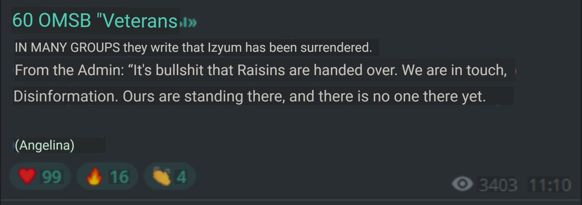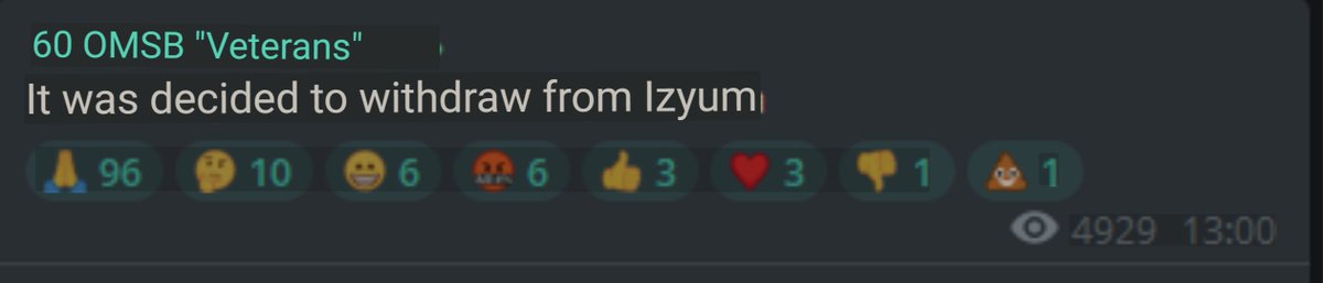 The channel for 60th Separate Motorized Rifle Battalion claimed they were still in Izium this morning, later today they stated the decision was made to retreat from Izium.