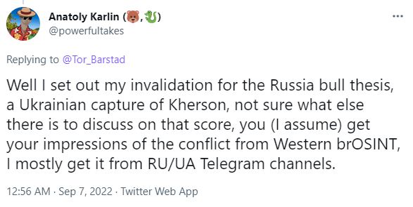 This is not "coping" because cope should by definition concern the conditions I preemptively outlined that would count as significant Russian defeats. Leaving Balakleia, a town of 27k (more like 15k now), and some villages, to Ukraine's tender mercies, is sad, but not a big deal.