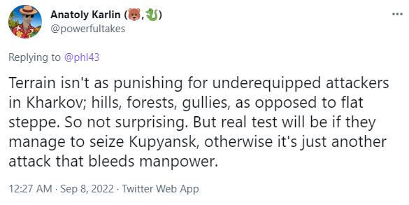As such, wherever Ukraine amasses a theater manpower advantage (8k vs 4k around Kharkov), and manages to buildup fuel and munitions, the Russian front crumples. Something we have just seen play out and may yet see again.