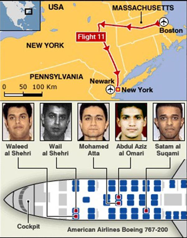 La mañana del 11-S, el vuelo 11 de American Airlines, pilotado por 2 EX-MILITARES de EEUU, es secuestrado por 4 terroristas a las 8:14.