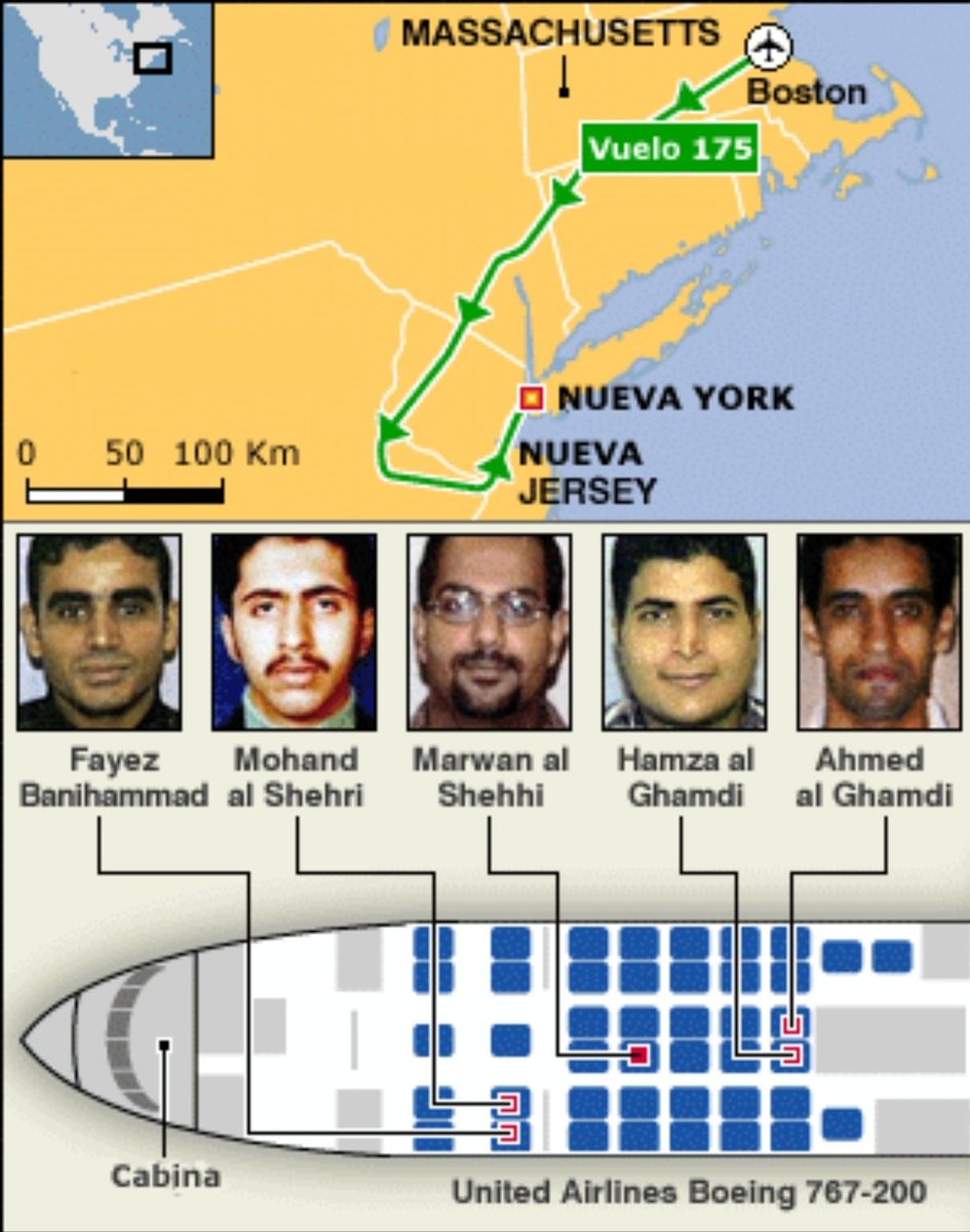 A su vez, el vuelo United 175 de Boston, de nuevo con 2 ex-militares estadounidenses a los mandos, es secuestrado por otros 5 terroristas.