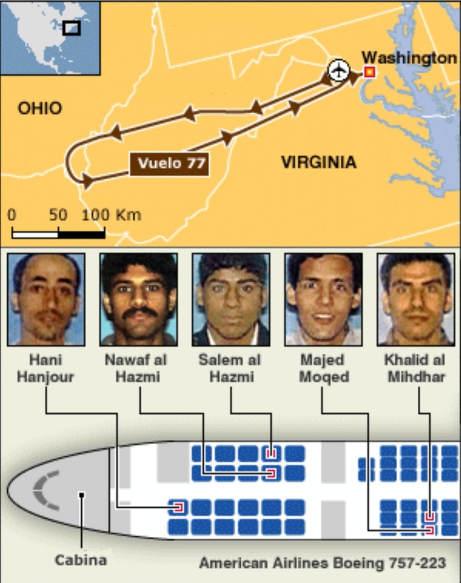 El tercer avión secuestrado, el Vuelo 77 de American Airlines, tenia por destino el Pentágono, con 5 terroristas a bordo.