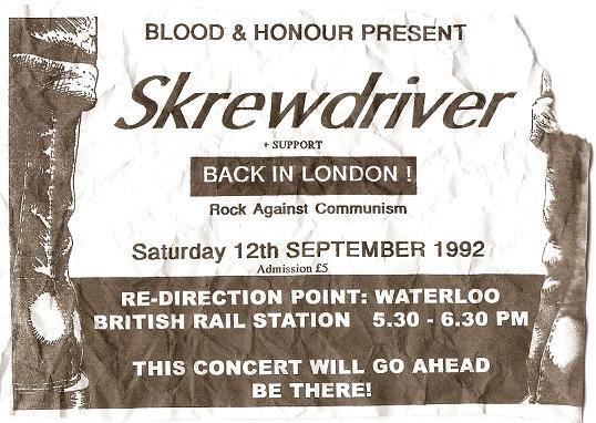 En pleno centro de Londres, en Waterloo, los nazis ingleses de Blood and Honour querían organizar el mayor concierto de rock nazi de la historia en Europa a través de la banda de rock fascista "Skrewdrive".